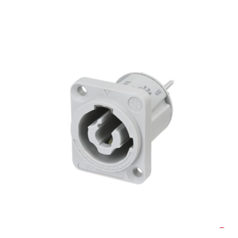 The Neutrik NAC3MPXXB-WOT chassis connector in grey ensures a robust connection with locking. It replaces IEC connectors where necessary and may also be plugged in and unplugged under load and voltage.